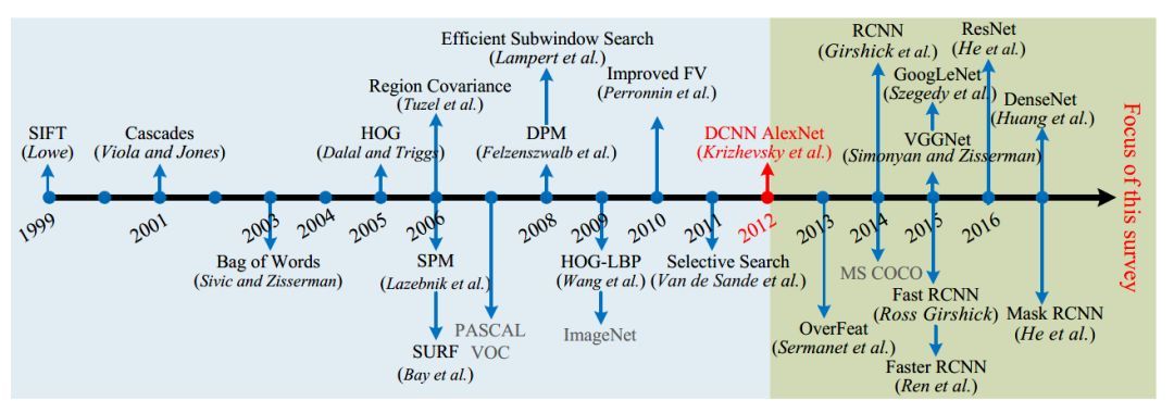 深度学习之前的早期目标检测算法的发展历程如上图左边浅蓝色部分所示。 2013 年之后,神经网络和深度学习逐渐取代了传统的图像检测算法而成为目标检测的主流方法。纵观这几年的深度学习目标检测发展历程,基于深度学习算法的一系列目标检测算法大致可以分为两大流派: