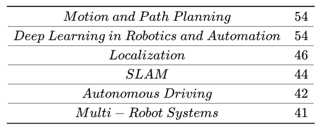 从以上关键词的统计可以看出,动作和路径规划,深度学习, SLAM,多机器人协作系统,移动机器人等都是最近几年比较火的方向。